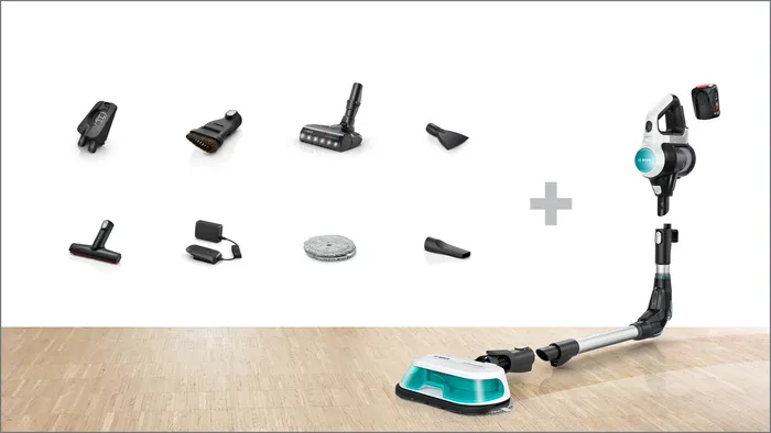 BOSCH Unlimited 7 ProHygienic Aqua Blanc 2-en-1 : L’Aspirateur laveur rechargeable 2-en-1 Unlimited 7 ProHygienic Aqua Blanc est un appareil moderne et polyvalent, conçu pour offrir un nettoyage complet, pratique et performant. Alliant fonction aspirateur et laveur, il permet de nettoyer en profondeur tous types de sols : carrelage, parquet, stratifié ou tapis à poils courts. Grâce à sa batterie longue durée, vous pouvez couvrir de grandes surfaces sans interruption. Son design léger et ergonomique assure une maniabilité optimale, même pour atteindre les recoins, escaliers ou zones difficiles d’accès.