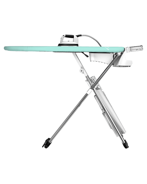 La table active bénéficie de deux fonctions : soufflerie pour tendre le tissu et éviter les faux plis, et aspiration pour le plaquer à plat lorsque nécessaire. Sa semelle 3D exclusive combine reliefs et diffusion vapeur homogène, pour un résultat impeccable dès le premier passage. Le fer, professionnel et robuste, offre un glissement fluide même sur les tissus épais.