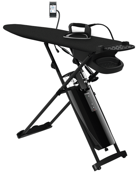 Le système est également connecté : application mobile pour guide d’utilisation, alertes d’entretien, tutoriels, etc. Le panneau « Universalcover » en gris foncé ajoute une touche esthétique et protège la table. Le fer pèse environ 1,1 kg, la puissance nominale de l’appareil est de 2 200 W, avec une pression de vapeur constante de 3,5 bar.