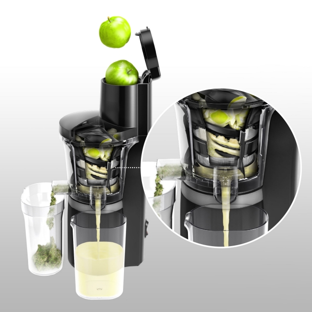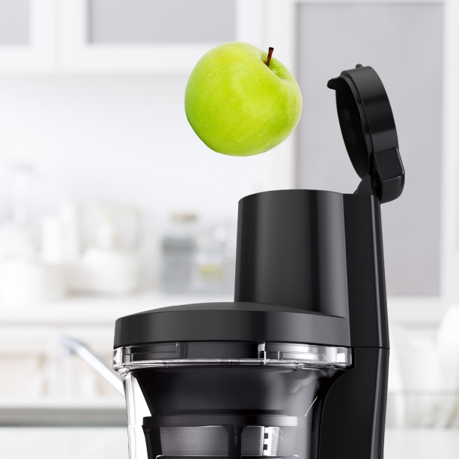 Ouverture d’entrée 75 mm — permet de passer des fruits de taille moyenne sans les couper, ce qui est très pratique.