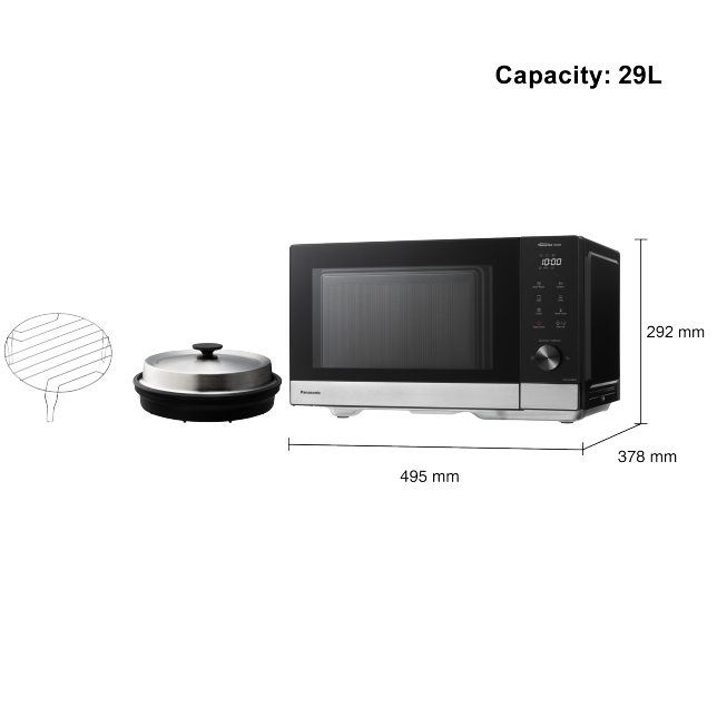 PANASONIC micro onde NN-GD38Q : Le Panasonic micro onde NN-GD38Q est un micro-ondes combiné (micro-ondes + gril + vapeur) compact mais très complet, pensé pour la cuisine moderne. Il offre une capacité intérieure généreuse de 29 litres tout en restant compact (dimensions extérieures 495 × 378 × 292 mm). Grâce à la technologie Inverter, il délivre une puissance réglable et homogène, évitant les zones trop cuites ou froides, et améliore la décongélation pour des résultats uniformes même sur des aliments délicats comme le chocolat.