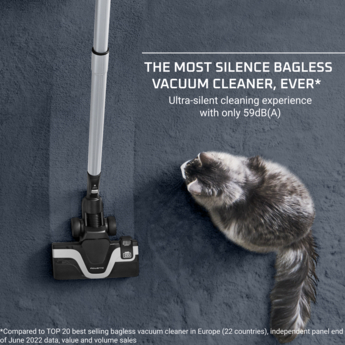 Niveau sonore très faible : 59 dB(A) à pleine puissance — le plus silencieux des aspirateurs sans sac sur le marché européen.
